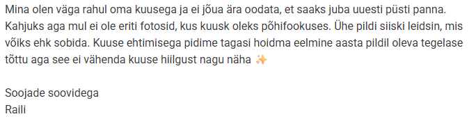 Soetatud kunstkuusk ei sisalda ehteid, kingipakke ega punutud korvi.
